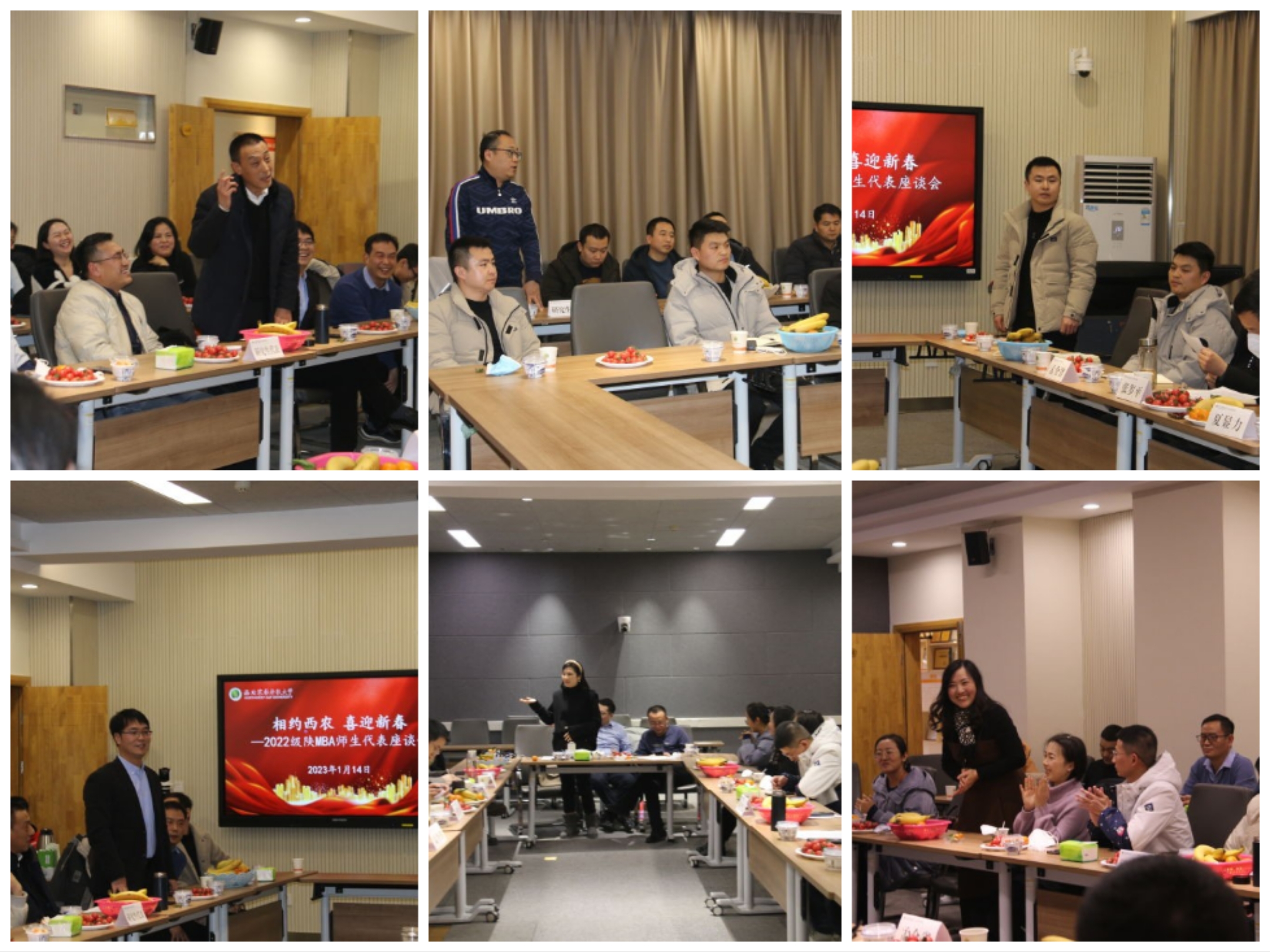 在同学们简短的自我介绍后,活动进入互动交流阶段。同学们就开学以来的上课方式、作业布置、求学感受等,畅所欲言;部分同学还就西农商圈、校友平台等提出好的建议和意见。老师们认真记录、积极回应;对于不同背景的同学提出的不同层次的需求与建议,与会老师一一作了细致的解答,使同学们更好地了解西农陕MBA项目的定位与课程设置情况,大家对未来的规划也更加清晰。会场无论哪位同学或老师发言,大家都会认真聆听,并时不时送去欢快的掌声。两个多小时的座谈,始终洋溢着欢乐的氛围。