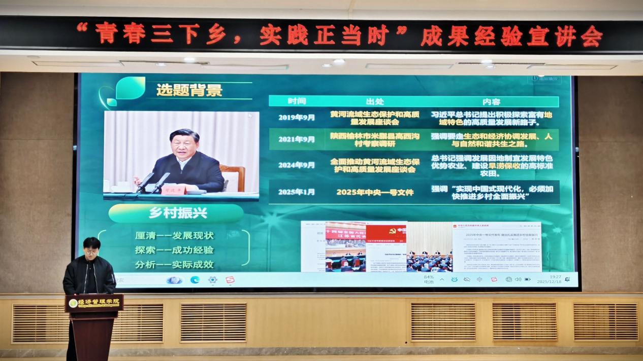 主持人首先强调了社会实践对于青年学生了解国情、增长才干、奉献社会的重要作用,并简要回顾了本年度经管学院社会实践的整体情况与取得的丰硕成果,随后四位主讲人依次上台,结合精心准备的图文与影像资料,生动详实地展示了各自团队的实践历程与深刻收获。